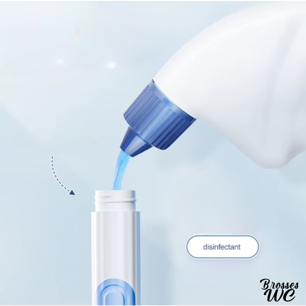 Le réservoir intégré assure une désinfection automatique, et la ventouse permet une fixation sans perçage, pour une installation rapide et sans trace.