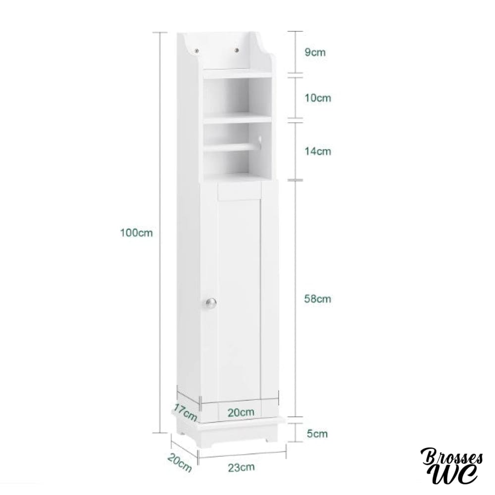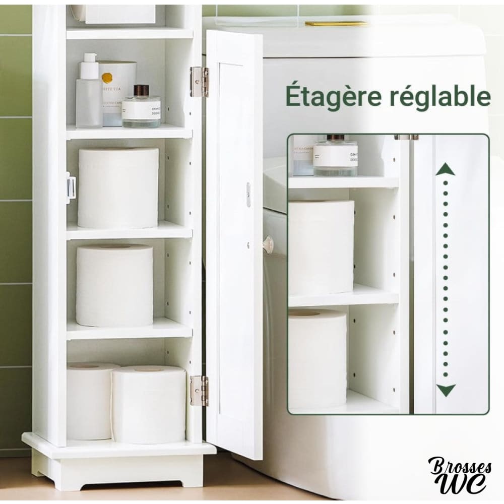 - 4 étagères réglables en hauteur : pour organiser rouleaux de papier toilette, produits d’entretien, brosse WC ou accessoires déco.