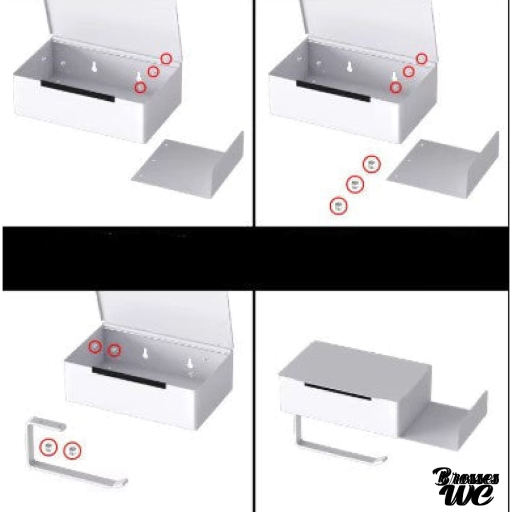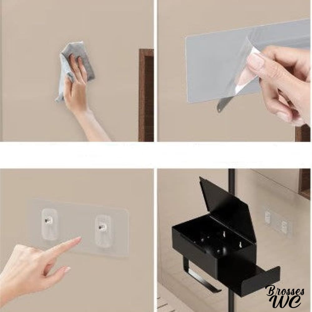 Ce porte-rouleau se fixe au mur par perçage ou adhésif, selon vos préférences et le type de surface.